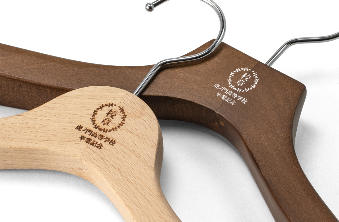フックは規定の線材を手配してメッキ加工を行い、ハンガー本体は磨き上げたものに色付けなどの加工を施します。レーザー印刷ではデータを作成し専用の機械で照射して仕上げます。使用する木材は自然由来のため一つひとつ木目や色味が異なり、さらに多くの工程が手作業となるため、安定した品質で仕上げることが重要になります。